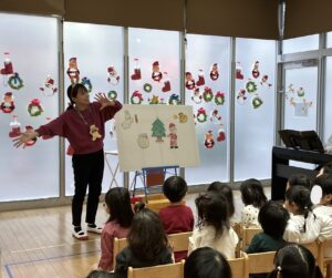 人前に立つことに少しドキドキしているお友だちもいれば、堂々とする姿を見せるお友だちがいたり、、、その姿に「かわいい~!」と話している5歳児のお友だちもいて、年下のお友だちを思いやるお兄さん・お姉さんらしさを感じました👦👧✨保育者の出し物”森のクリスマス”のパネルシアターでは、「メリメリクリスマス~♪」と歌いながら楽しんでいましたよ。