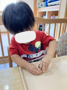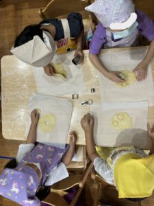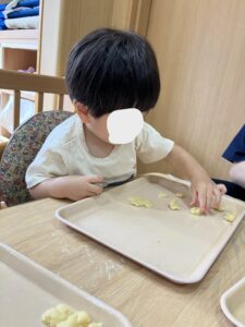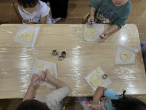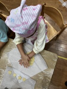 0.1歳児は型抜きを、4.5歳児は生地作り~型抜きまで行いました。□や☆、〇などの好きな形を選び、ぎゅっ!