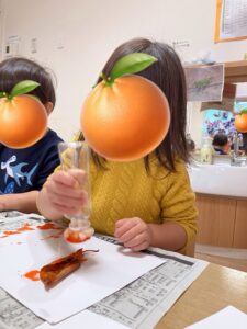 食べ物の大切さを伝えると、「やさしく触る!」と自分たちで考えながら触る姿が見られました。