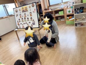 “オニのパンツ”の歌に因んで3人の鬼にパンツを渡してあげる活動をすると、それぞれの色の鬼にパンツを渡し楽しんでいました。