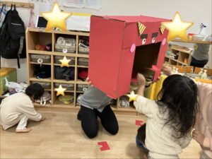 中にはカーテンや玄関マットを付けたり、お風呂や車など、生活に必要なものを子ども達自身で考え作ることを楽しみました。