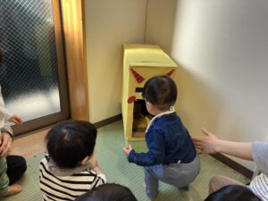 “オニのパンツ”の歌に因んで3人の鬼にパンツを渡してあげる活動をすると、それぞれの色の鬼にパンツを渡し楽しんでいました。