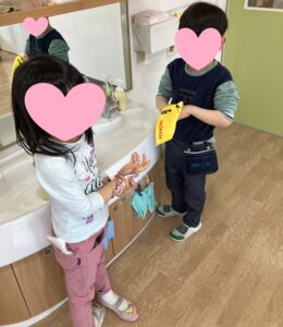 小学校へ向けて、5歳児クラスで自分のハンカチ・ティッシュを使う練習を始めました。