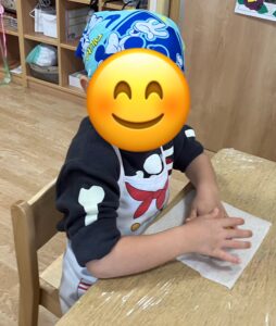 「いただきます」や「ごちそうさま」の挨拶も、笑顔で「す(いただきます)」「た(ごちそうさまでした)」と言って、手を合わせています♪