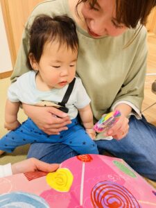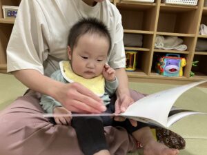 0歳児ざくろ組のお友だちは、初めてウィズブック絵本を保育者と一緒に見たり・・・